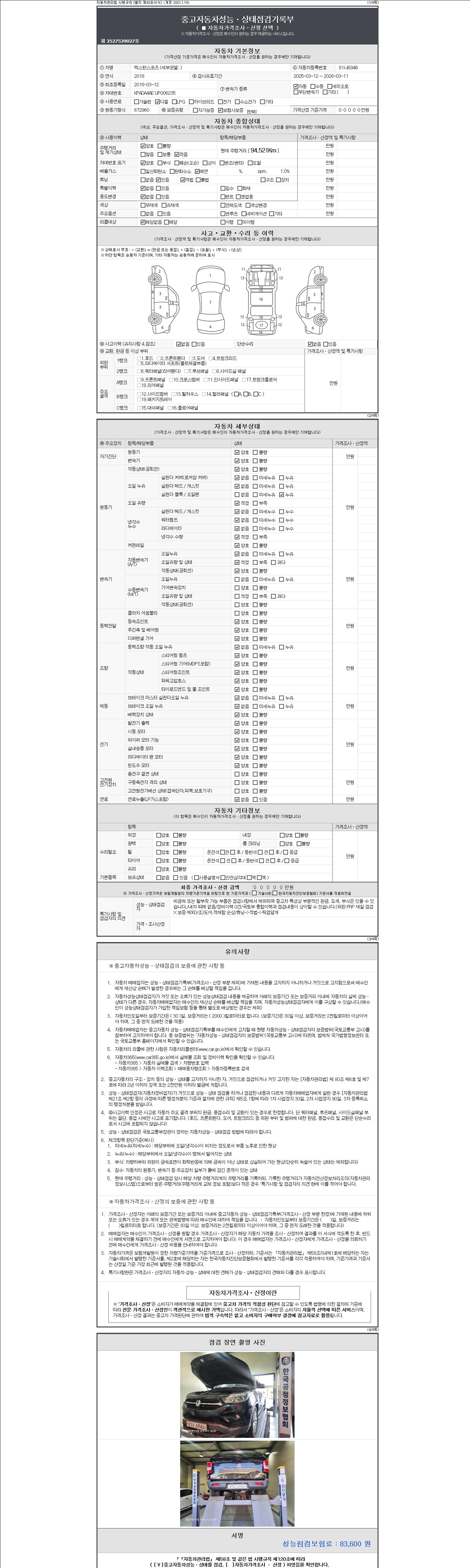 | 주행거리 | 94,521 km | 차량번호 | 81나6946 | 사고유무 | 성능기록부 참조 | 제시번호 | 제 2147483647 호 |