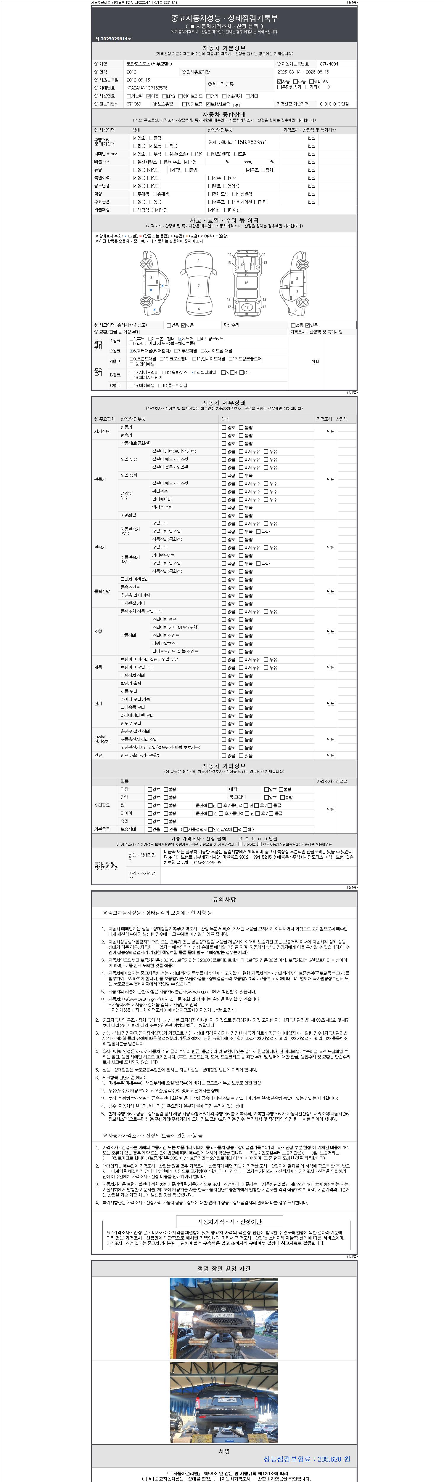 | 주행거리 | 158,263 km | 차량번호 | 87나4894 | 사고유무 | 성능기록부 참조 | 제시번호 | 제 2147483647 호 |
