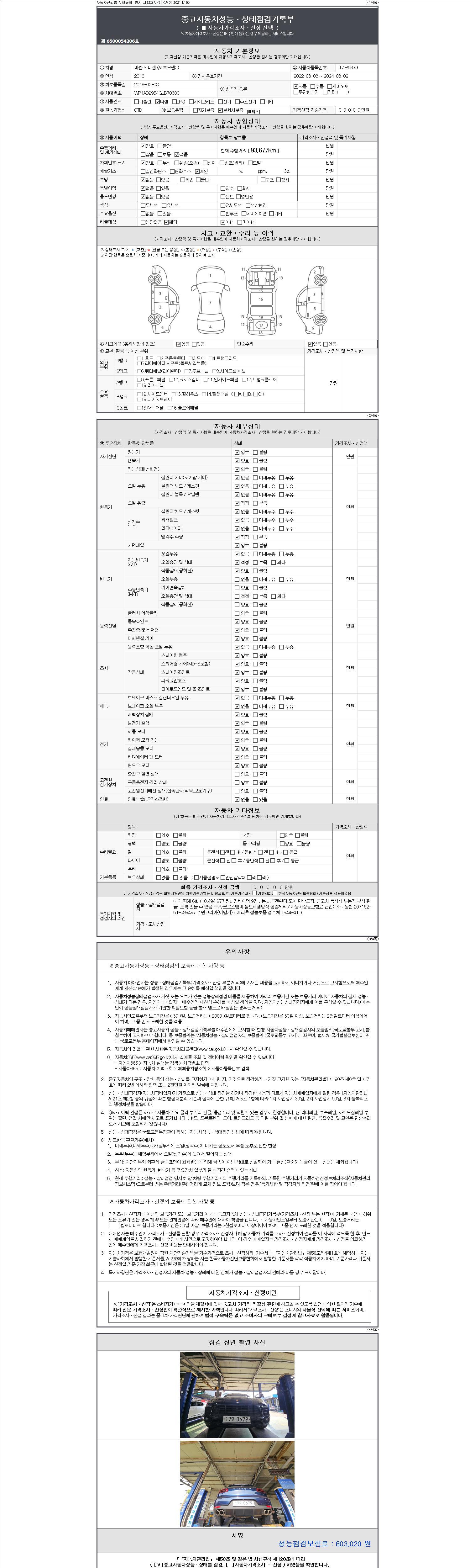 | 주행거리 | 93,655 km | 차량번호 | 17모0679 | 사고유무 | 성능기록부 참조 | 제시번호 | 제 2147483647 호 |