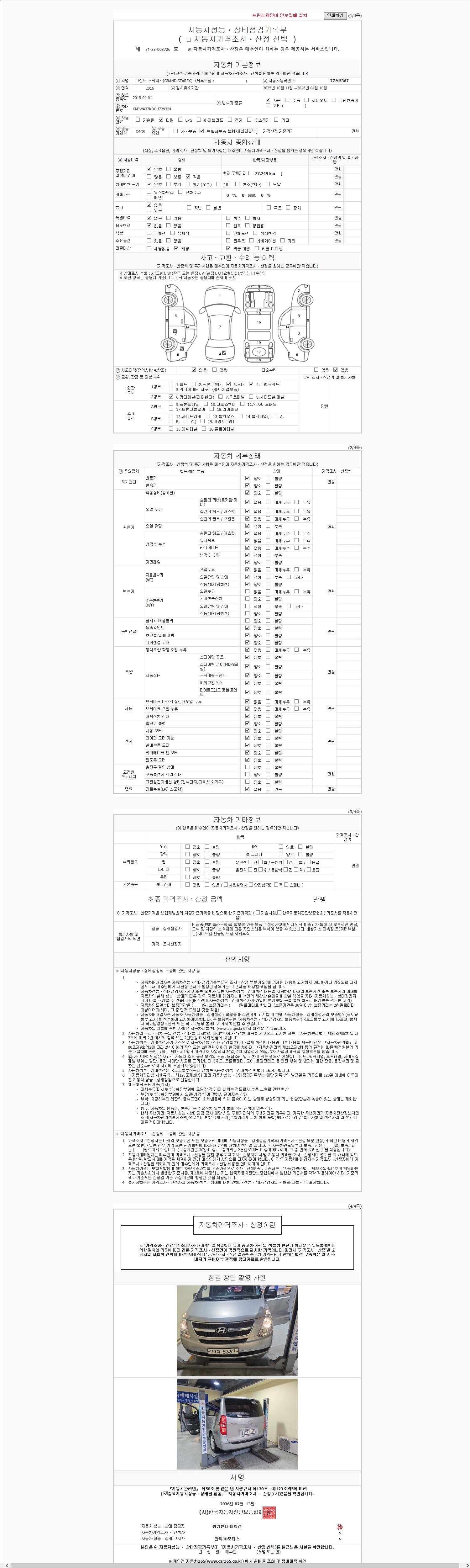 | 주행거리 | 77,189 km | 차량번호 | 77저5367 | 사고유무 | 성능기록부 참조 | 제시번호 | 제 2147483647 호 |