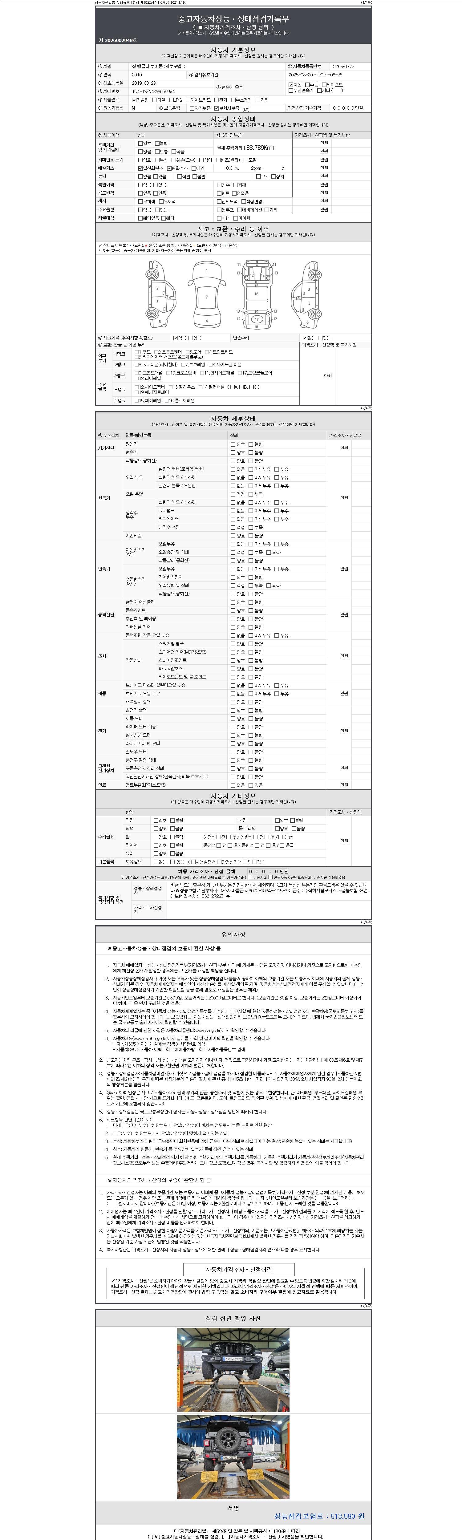 -중고자동차 매매업자를 통해 차량을 구입하실 경우 반드시 "중고자동차 성능, 상태점검 기록부"를 교뷰 받으셔야 하며, 매매업자는 반드시 의무 교부 하여야 압니다.