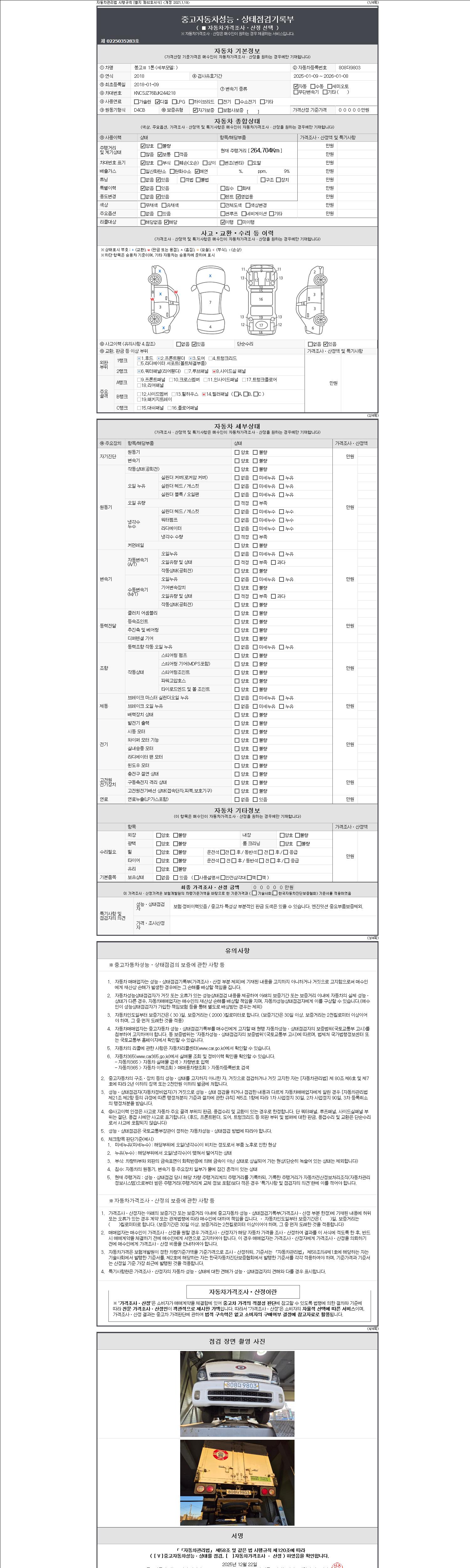 | 주행거리 | 264,704 km | 차량번호 | 808더9803 | 사고유무 | 성능기록부 참조 | 제시번호 | 제 2147483647 호 |