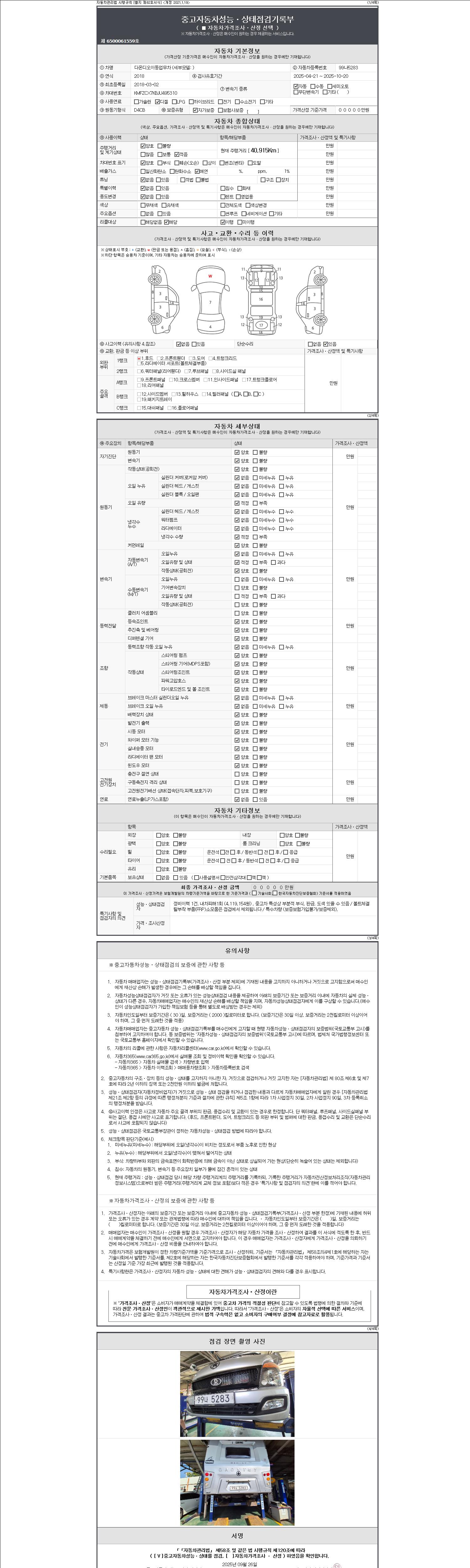 자동차관리법 시행규칙 제120조의 규정에 따라 별지 제 82호서식 《중고자동차 성능, 상태점검 기록부》를 발행한 성능, 상태점검자 및 매매자는 아래의 보증기간 또는 보증거리 이내의 중고자동차, 성능점검 기록부에 기재된 내용과 자동차의 실제 성능, 상태가 다른 경우 계약 또는 관계법령에 따라 매수인에 대하여 책임을 집니다.