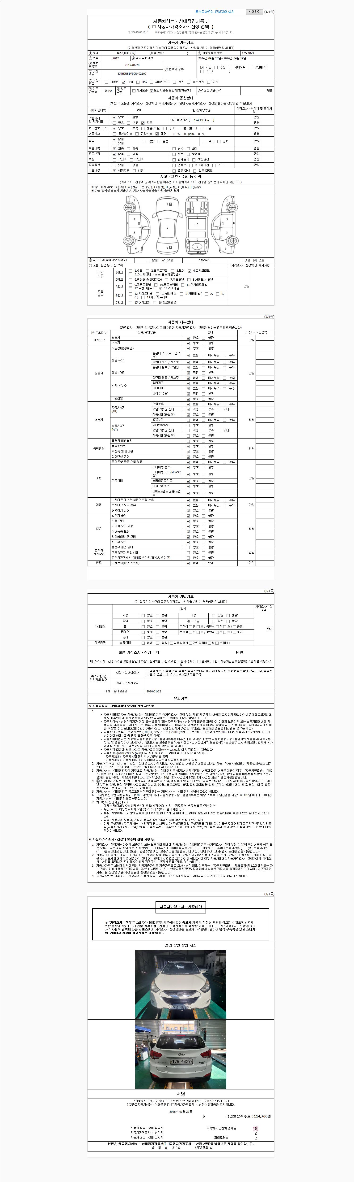 | 주행거리 | 174,130 km | 차량번호 | 17모4829 | 사고유무 | 성능기록부 참조 | 제시번호 | 제 2026004128 호 |